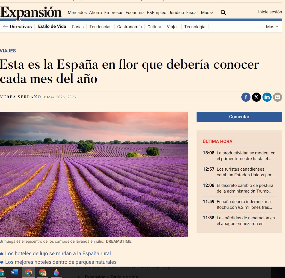 Desde su lanzamiento oficial en enero y su consolidación en FITUR 2025 —donde recibió el Premio al Mejor Producto de Turismo Activo otorgado por IFEMA y la revista Al Aire Libre—, España en Floración ha logrado una repercusión mediática de gran calado, con más de 40 apariciones en medios de comunicación nacionales, especializados y regionales, alcanzando un impacto potencial superior a los 70 millones de personas. En este enlace puedes descargar el clipping de prensa.
