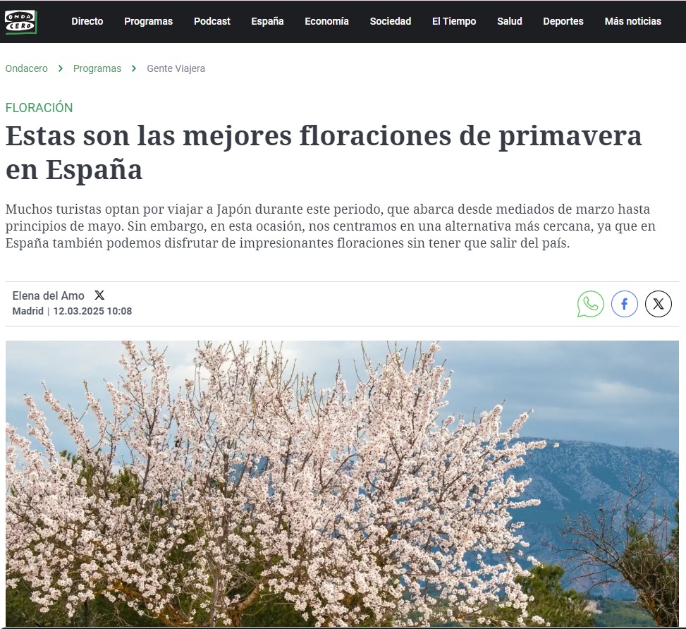 El proyecto ha sido protagonista en algunos de los medios más influyentes del país, como el programa de Comando Actualidad de TVE El País (suplemento El Viajero), ABC, 20 Minutos, Expansión, National Geographic, MSN Noticias o La Cadena SER, donde el periodista Paco Nadal dedicó un espacio destacado al fenómeno del turismo de floración en el programa La Ventana. También ha ocupado titulares y reportajes en Onda Cero (Gente Viajera), RNE (Mundo Rural), EFEAGRO, y revistas especializadas como Traveler, Al Aire Libre, Descubrir o Infortursa.